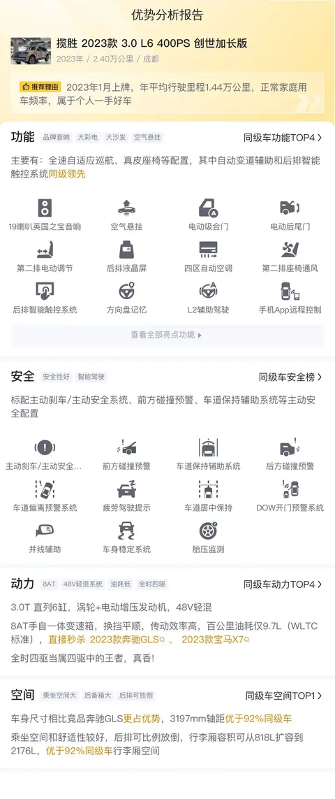 综上所述的新车含税价、用车成本、市场行情、优势分析、同款比价等数据仅供参考。在配置部分,因为二手车非标品,车辆可能会存在配置改装的情况,具体车况信息需要线下结合车辆实际情况进行综合参考。