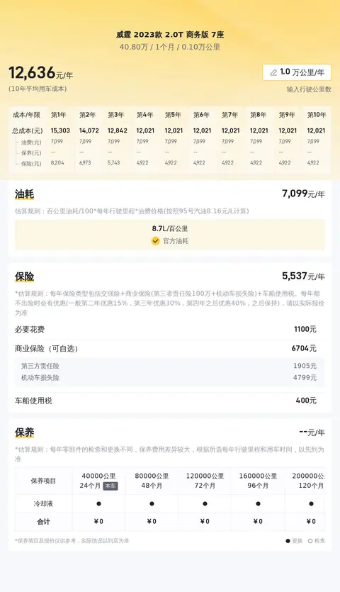 目前,这款威霆的市场行情价在26.19万-31.22万之间,它的报价则为40.80万,报价高于市场行情价,价格上没有优势,但考虑到改装成本和使用成本,也属合理。据估算,同级车用车成本最低11798元/年,最高14920元/年,威霆是13133元/年,用车成本适中。