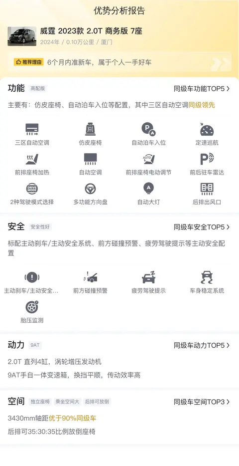 综上所述的新车含税价、用车成本、市场行情、优势分析、同款比价等数据仅供参考。在配置部分,因为二手车非标品,车辆可能会存在配置改装的情况,具体车况信息需要线下结合车辆实际情况进行综合参考。