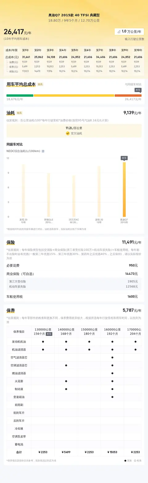 据估算,奥迪Q7 2015款 40 TFSI 典藏型的用车成本也较高,因为它的用车成本是25658元/年,而同级车的最低用车成本是16943元/年,最高是35781元/年,所以较高。