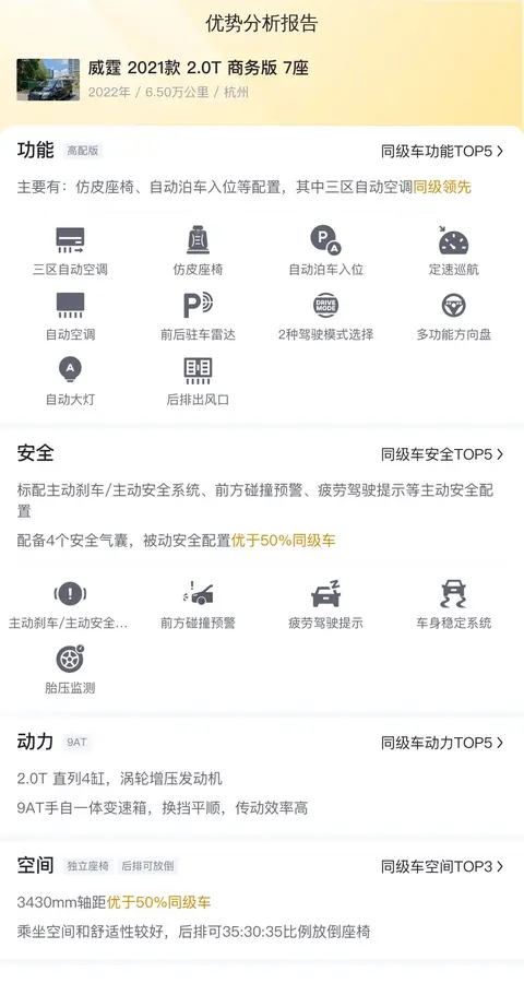 从威霆(2021款 2.0T 商务版 7座)的配置表上看,这台车的配置还是非常丰富的。在安全性方面,标配主动刹车/主动安全系统、前方碰撞预警、车身稳定系统等主动安全配置,配备8个安全气囊,被动安全配置优于96%同级车。在动力方面,搭载的是2.0T 直列4缸涡轮增压发动机,最大输出功率是155kW,最大扭矩是350N·m,与之匹配的是9AT手自一体变速箱,加95号汽油,国VI排放标准,动力表现优于68%同级车。在空间方面,3430mm轴距优于70%同级车,第二排可以前后移动,第三排座椅可以35:30:35比例放倒,行李厢容积是1010L,优于89%同级车行李厢空间。在内饰方面,座椅材质是仿皮,方向盘支持上下+前后调节,各排座椅空间比较宽敞,舒适性有一定保障。在外观方面,前脸是三叉星徽标和单横幅闪钻格栅,轮胎规格是235/50 R18,配合新造型LED高性能大灯和LED尾灯,外观时尚感还不错。在其他配置方面,标配了定速巡航、自动驻车、上坡辅助、换挡拨片等配置,其中定速巡航这项配置让开车更轻松,优于76%同级车。总体来看,这台车的配置还是比较丰富的。