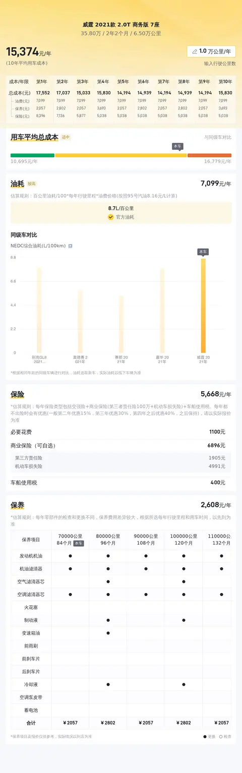 据估算,威霆(2021款 2.0T 商务版 7座)的10年平均用车成本是15133元/年,同级车的最低10年平均用车成本是14360元/年,最高是17727元/年,所以用车成本适中。