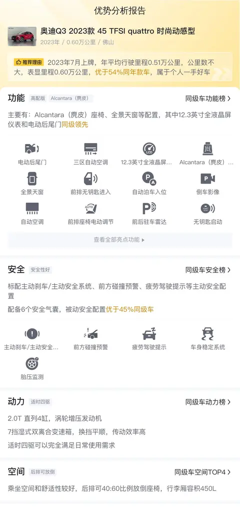 在竞争日益激烈的汽车市场中,每一款车型都拥有其独特的优势和不足之处。今天我们就来深入剖析一下奥迪Q3 2023款 45 TFSI quattro时尚动感型,帮助您做出更加明智的购车决策。首先,我们来看看这款车型的核心竞争优势。奥迪Q3 2023款 45 TFSI quattro时尚动感型搭载了高效的发动机和先进的quattro四轮驱动系统,这不仅保证了出色的驾驶性能,还提供了卓越的燃油经济性。其次,车辆内饰采用了高品质材料,营造出豪华舒适的乘坐环境,同时配备了智能互联技术和丰富的娱乐功能,让每一次出行都成为一次愉悦的体验。然而,完美总是相对的,每款车型也难免会有其不足之处。对于奥迪Q3 2023款 45 TFSI quattro时尚动感型来说,一些消费者反映其后排空间相对较为局促,可能不太适合长途乘坐。另外,虽然车辆的整体配置较为丰富,但在某些细节上仍有提升空间,例如隔音效果和悬挂系统的舒适性等。