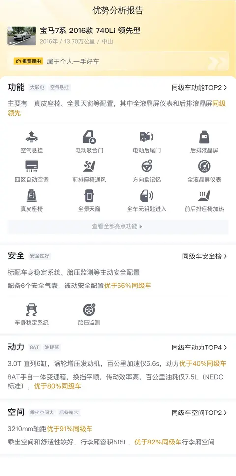 根据懂车帝的估算,这辆二手宝马7系2016款740Li领先型的10年平均用车成本为23,188元/年,相较于同级别车型,其用车成本处于较高区间。这一方面是由于宝马7系作为豪华车型,其维护和保养成本本身就较高;另一方面也可能与该车的具体情况有关,例如行驶里程、使用频率等因素都可能影响到用车成本。对于潜在买家来说,除了考虑购车成本外,还需要充分考虑到日常使用的实际成本,包括油费、保养费、保险费等,并结合自身经济状况和用车需求做出合理的选择。