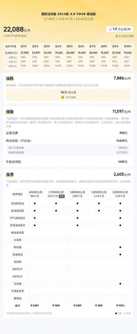 在用车成本方面,根据估算数据,这辆揽胜运动版 2013款 3.0 TDV6 柴油版的年均综合用车成本约为2.2万元。这一数字包括了燃油、保险以及保养等方面的支出。需要注意的是,这一估算仅供参考,实际费用可能会因个人使用习惯和维护情况而有所不同。
