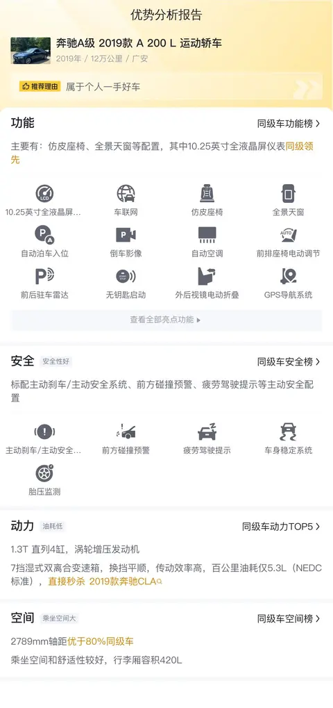 据估算,同级车的用车成本最低是5143元/年,最高是13181元/年,奔驰A级 2019款 A 200 L 运动轿车的是10677元/年,用车成本不算低。
