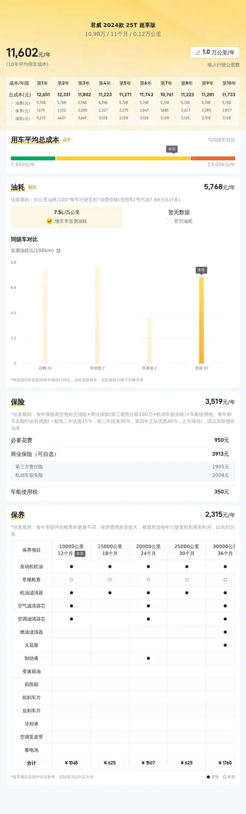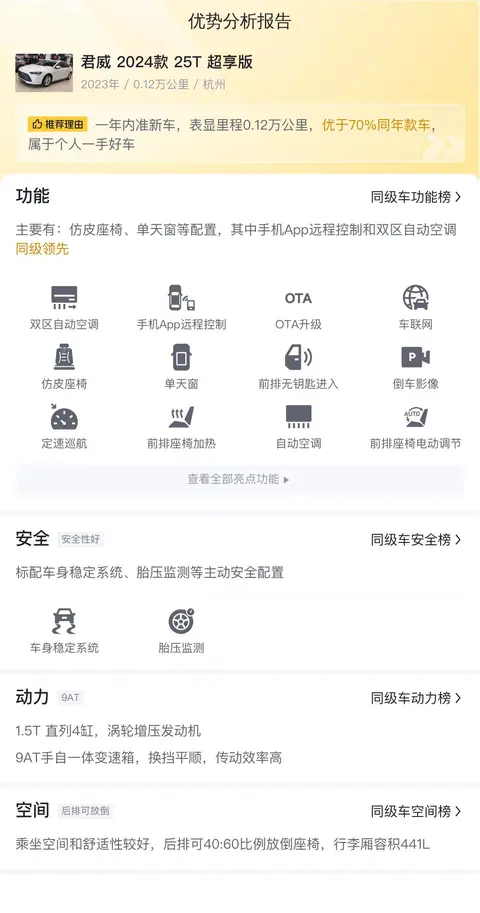 综上所述的新车含税价、用车成本、市场行情、优势分析、同款比价等数据仅供参考。在配置部分,因为二手车非标品,车辆可能会存在配置改装的情况,具体车况信息需要线下结合车辆实际情况进行综合参考。