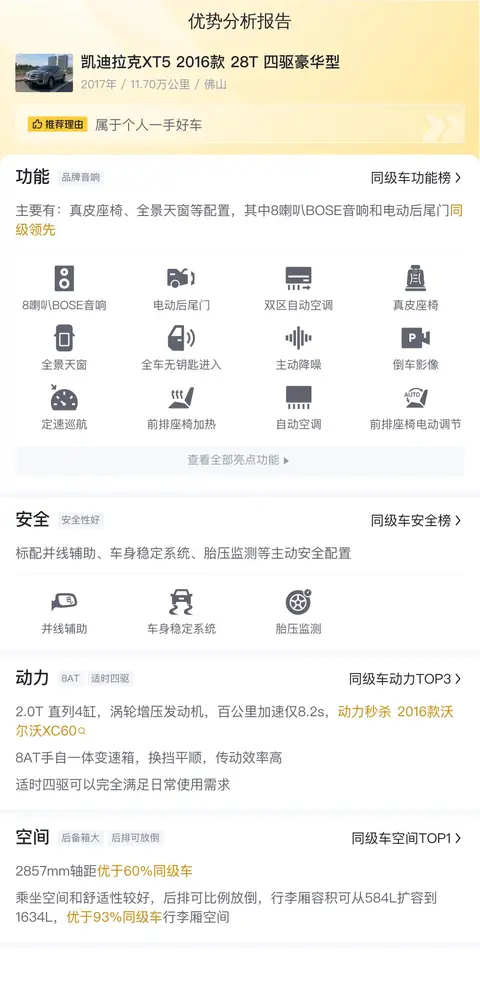 这辆凯迪拉克XT5 2016款 28T 四驱豪华型的优势之一就是价格,如今这辆四驱豪华型的二手卖价仅为11.88万,四驱系统很好的拓展了用车场景,不单单只是城市通勤,还可以郊外自驾游之类的。配置上带有OTA升级,系统可以更新加入更多功能,让车越用越好用;第二排电动调节,第二排乘客也可以调节座椅,设计很人性化。动力上,8.2s的加速成绩放在现在依旧拿的出手。