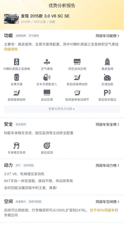 这款2015款发现3.0 V6 SC SE在配置上相当丰富,它配备了全景天窗、真皮座椅、英国之宝音响、第二排电动调节以及车载冰箱等高端配置。在安全方面,该车拥有全方位的多重安全保障体系,包括多项辅助及安全配置,为乘客提供了极致的保护。在动力与操控方面,它搭载了3.0T 340马力V6发动机,配合8挡手自一体变速箱和全时四驱系统,使得驾驶者能够轻松应对各种路况。此外,车辆还配备了先进的TCS系统,确保在复杂路面条件下的稳定性。总体而言,这款车型以其豪华的配置、出色的动力性能和卓越的安全性能,成为了市场上备受瞩目的焦点。