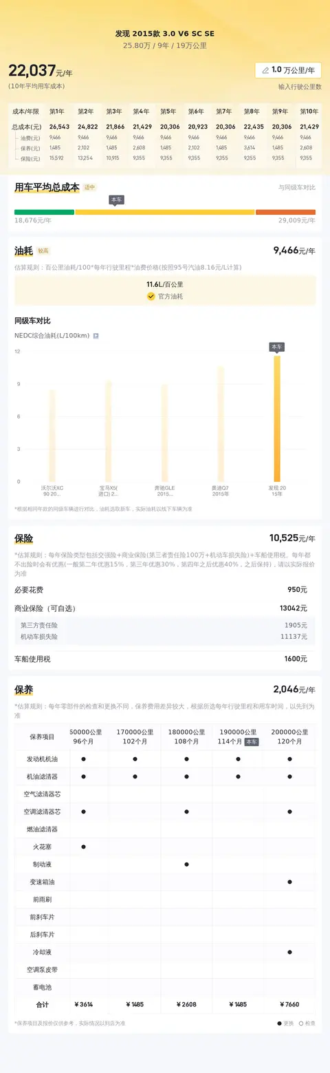 在用车成本方面,根据估算,这辆二手路虎发现2015款3.0 V6 SC SE的年均综合用车成本约2.2万元左右,具体费用根据用车强度和环境等因素有所改变。