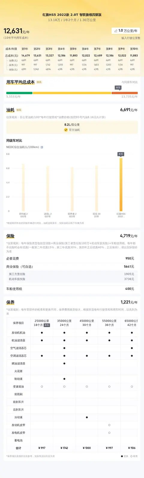 根据懂车帝官方的大数据分析,红旗HS5 2022款 2.0T 智联旗领四驱版的10年平均用车成本大约在13155元/年,与同级别车型相比处于较高水平。这主要是因为该车系的功能配置比较全面高端,当然具体的用车成本还是要根据车主的实际使用情况而定。