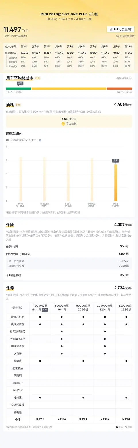 当前这款MINI的二手车行情在10万至13万左右,当然,行情价和成交价之间还是有区别,具体还得看车况表现如何。从用车成本来看,这辆车的预估年均使用成本大约在1.1万元左右,这项开销具体金额跟车主的驾驶习惯和行车环境有直接关系。