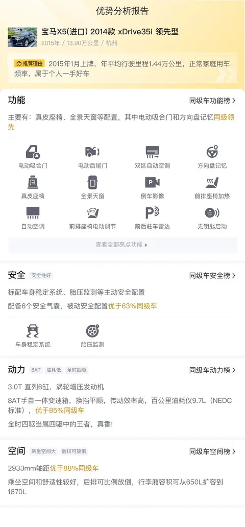综上所述的新车含税价、用车成本、市场行情、优势分析、同款比价等数据仅供参考。在配置部分,因为二手车非标品,车辆可能会存在配置改装的情况,具体车况信息需要线下结合车辆实际情况进行综合参考。