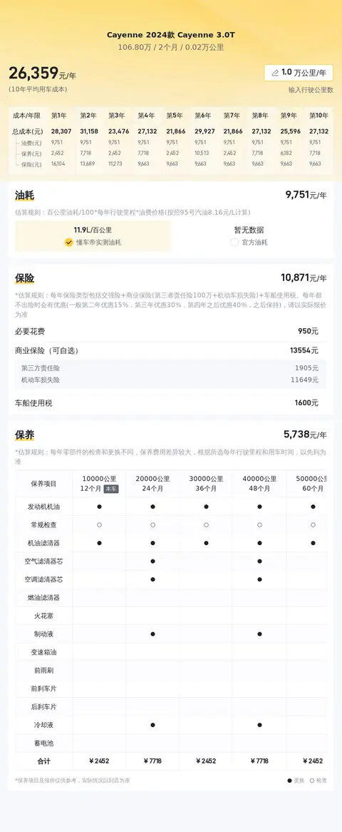 根据估算,Cayenne 3.0T的百公里油耗为11.4L。以当前油价(假设为8.02元/L)计算,每年行驶1万公里的情况下,该车的燃油成本约为11,400元。需要注意的是,实际油耗可能因驾驶习惯、路况等因素而有所差异。