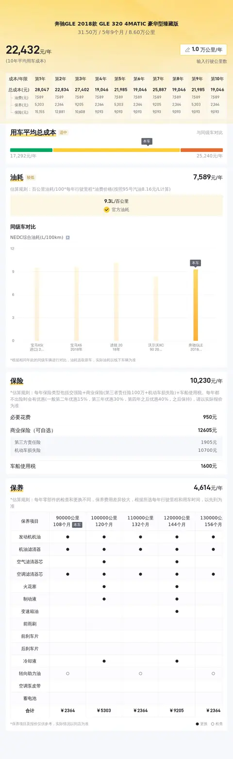 根据懂车帝大数据分析,这辆奔驰GLE 2018款 GLE 320 4MATIC 豪华型臻藏版在二手车市场上,价格在35.79至42.21万之间,而该车报价为31.5万,低于市场价,在市场价中偏低,保值率高,现在购买很合适。这辆车的10年平均用车成本是22403元/年,40岁+的成熟男性用车,一般不会太离谱,估计也就在一二百左右波动,不用太担心。