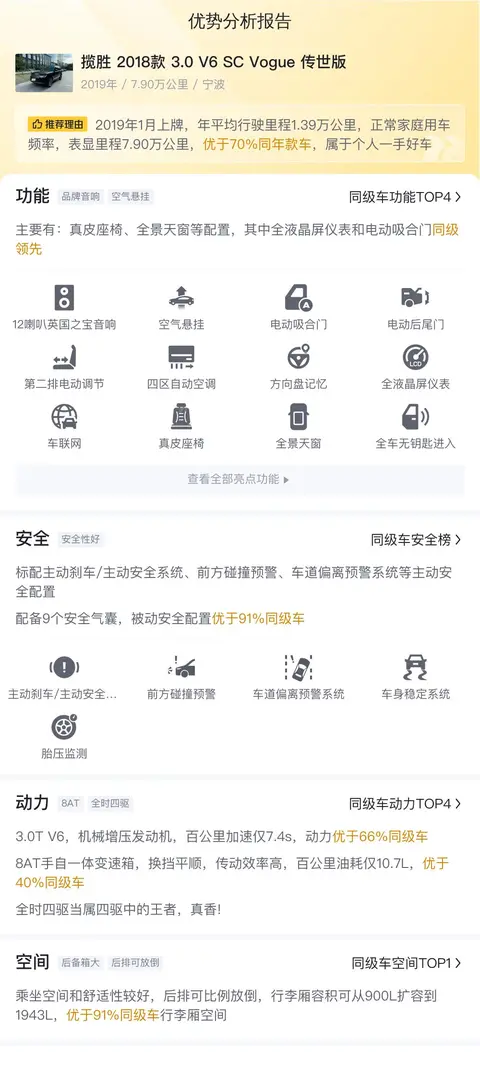 综上所述的新车含税价、用车成本、市场行情、优势分析、同款比价等数据仅供参考。在配置部分,因为二手车非标品,车辆可能会存在配置改装的情况,具体车况信息需要线下结合车辆实际情况进行综合参考。
