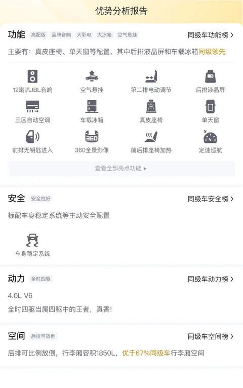 优势:外观霸气,开出去回头率贼高,开车视野很好,适合长途自驾游,不仅能满足代步需求,还能满足越野需求,实力不容小觑。