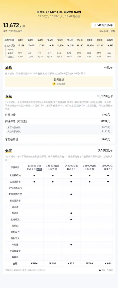 据估算,普拉多 2014款 4.0L 自动VX NAVI的用车成本是11515元/年,毕竟是越野车,有这个花费也算正常。