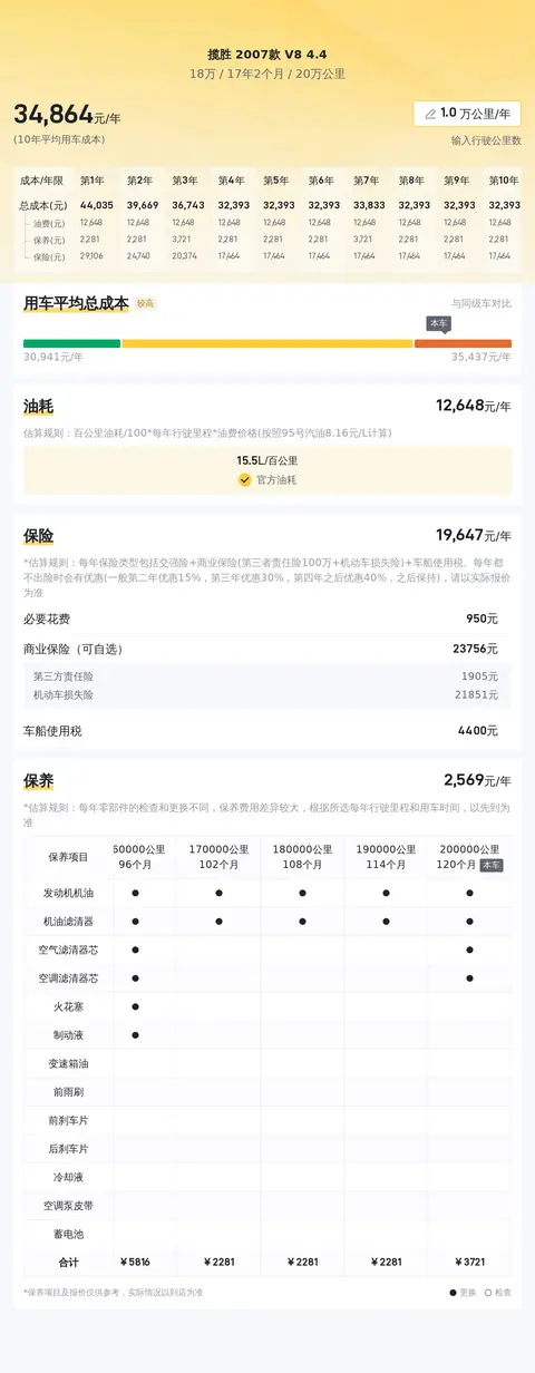 根据当前市场行情显示,这款揽胜 2007款 V8 4.4的二手车价格区间在6.91万至9.15万之间。然而,该车的报价达到了18万,相较于市场行情而言,价格偏高。在用车成本方面,按照每年行驶1万公里计算,10年平均用车成本约为34678元/年,相较于同级别车型而言,处于较高水平。这主要是由于该车综合油耗约为15.5L/100km,燃油成本较高。此外,该车未来三年的贬值率也较低,预计每年会贬值1.08万元左右。因此,在购买前,建议您充分考虑自身经济实力和用车需求,谨慎做出决策。