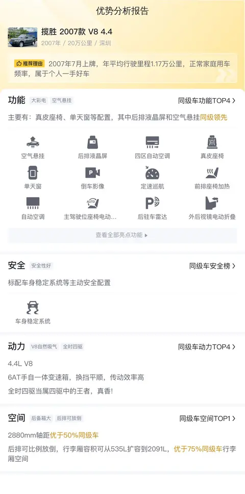 综上所述的新车含税价、用车成本、市场行情、优势分析、同款比价等数据仅供参考。在配置部分,因为二手车非标品,车辆可能会存在配置改装的情况,具体车况信息需要线下结合车辆实际情况进行综合参考。