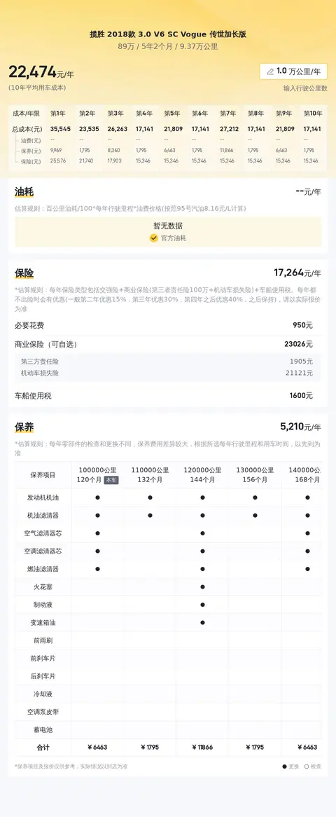 根据当前市场行情,这款路虎揽胜2018款3.0 V6 SC Vogue 传世加长版的二手车价格在76万元至93万元之间。从五年多的使用情况来看,这辆车的售价属于合理的区间内。在用车成本方面,根据估算,这辆车的年均综合用车成本约为每年2.3万元左右。具体费用包括保险、燃油、保养和其他费用。其中,保险费用大约为每年11665元,燃油费用约为每年11118元,保养费用大约为每年6108元。其他费用因人而异,这里暂不计算在内。
