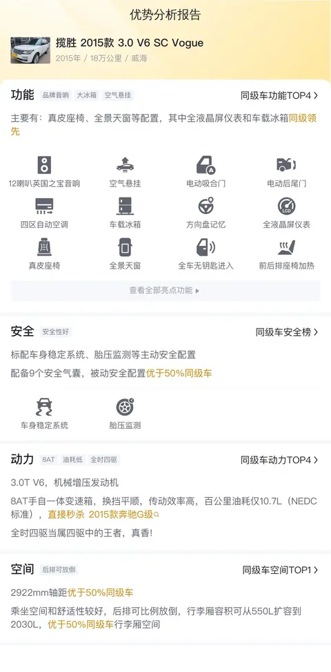 那么,今天给大家带来的这款揽胜 2015款 3.0 V6 SC Vogue,新车含税价为170.58万,现在的二手车报价是41.80万,2015年9月首次上牌,在此期间过户3次。截止目前,该车行驶里程为18万公里,该车符合国VI排放标准。车源所在地和上牌地都在威海。车身颜色为白色,支持无钥匙启动、电动尾门等配置。