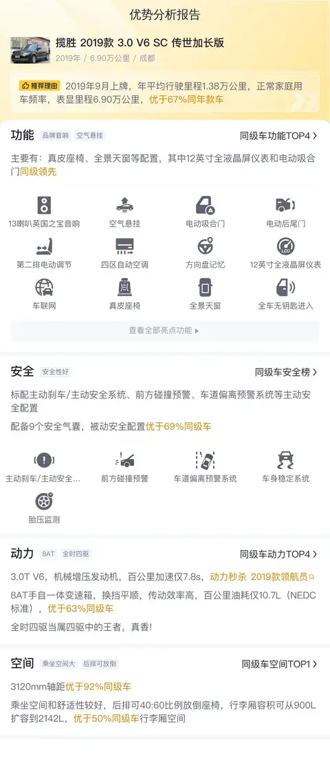 综上所述的新车含税价、用车成本、市场行情、优势分析、同款比价等数据仅供参考。在配置部分,因为二手车非标品,车辆可能会存在配置改装的情况,具体车况信息需要线下结合车辆实际情况进行综合参考。