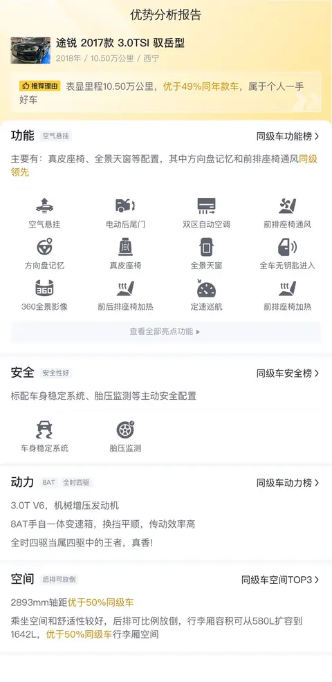 综上所述的新车含税价、用车成本、市场行情、优势分析、同款比价等数据仅供参考。在配置部分,因为二手车非标品,车辆可能会存在配置改装的情况,具体车况信息需要线下结合车辆实际情况进行综合参考。