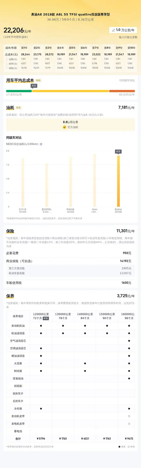 据估算,奥迪A8 2018款 A8L 55 TFSI quattro豪华定制版的用车成本较低,因为同级车最低用车成本是18798元/年,最高是43746元/年,奥迪A8 2018款 A8L 55 TFSI quattro豪华定制版是21680元/年。