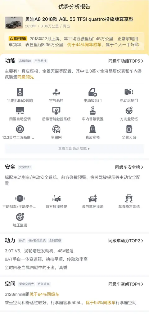 总结:奥迪A8作为奥迪品牌的旗舰轿车,自然是有其过人之处。它不仅提供了优质的驾驶和乘坐体验,还展现了奥迪在科技创新和豪华感方面的实力。尽管维护成本可能相对较高,但对于追求卓越品质和独特魅力的消费者而言,奥迪A8仍旧是一个极具吸引力的选择。而这辆奥迪A8 2018款 A8L 55 TFSI quattro豪华定制版,如今二手价格只要36.98万,不到新车价格的一半,性价比还是不错的,如果你在豪华旗舰车型中有需求,不妨就考虑一下吧!