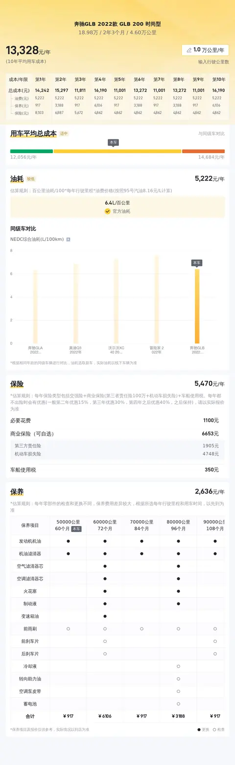 当然啦,买车可不止是买车本身,还得考虑养车的成本。根据估算,这辆GLB的年均综合用车成本在1.3万元左右。再开个三五年,它的残值还能保持在15.82万到19.11万之间。这保值率,杠杠的!