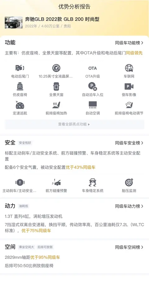 不过呀,选车还得根据自己的实际情况来。或许你更喜欢越野,或许你更看重品牌。但话说回来,奔驰GLB 2022款 GLB 200 时尚型在这三个方面都表现得相当均衡。它既有奔驰品牌的光环,又有不错的空间表现,同时还兼顾了动力和油耗。如果你正在寻找一辆全面发展的SUV,那么这辆二手奔驰GLB,绝对值得你考虑。