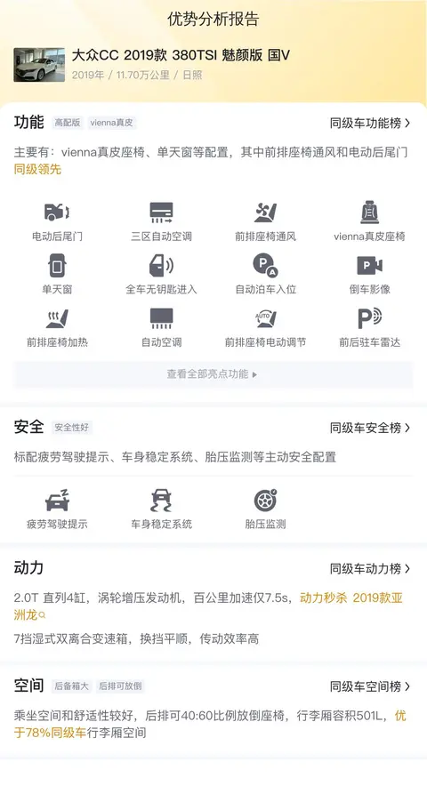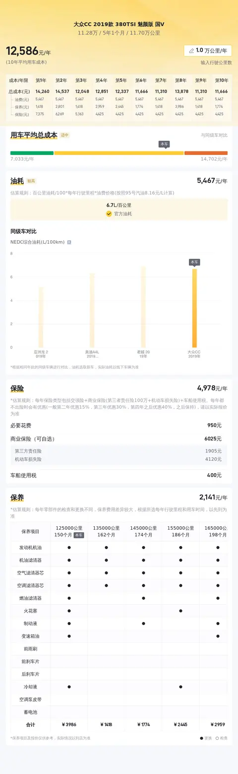 据估算,同级车的最低用车成本是6506元/年,最高是15783元/年,大众CC 2019款 380TSI 魅颜版 国V是12633元/年,用车成本适中,不占什么优势。