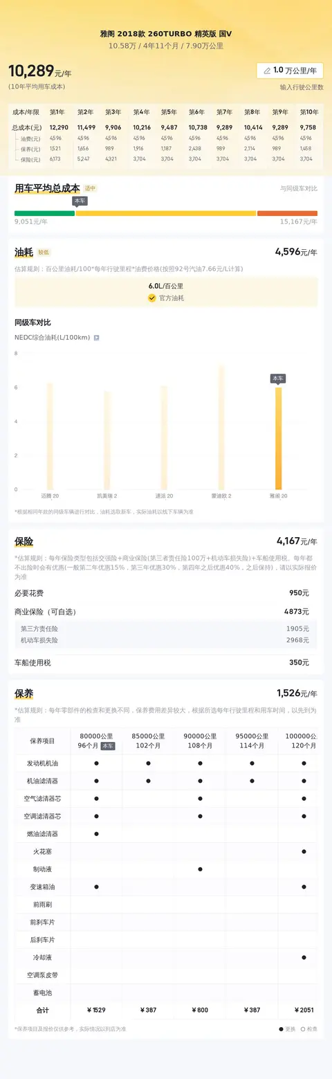 雅阁2018款260TURBO精英版的百公里油耗为6升左右,对于追求经济性的消费者来说,这是一个相当友好的数字。按照每年行驶1万公里计算,加上保险费用约4235元和保养费用约1003元,每年的用车成本大约为11406元,这样的用车成本在市场上还是具有一定的竞争力的。
