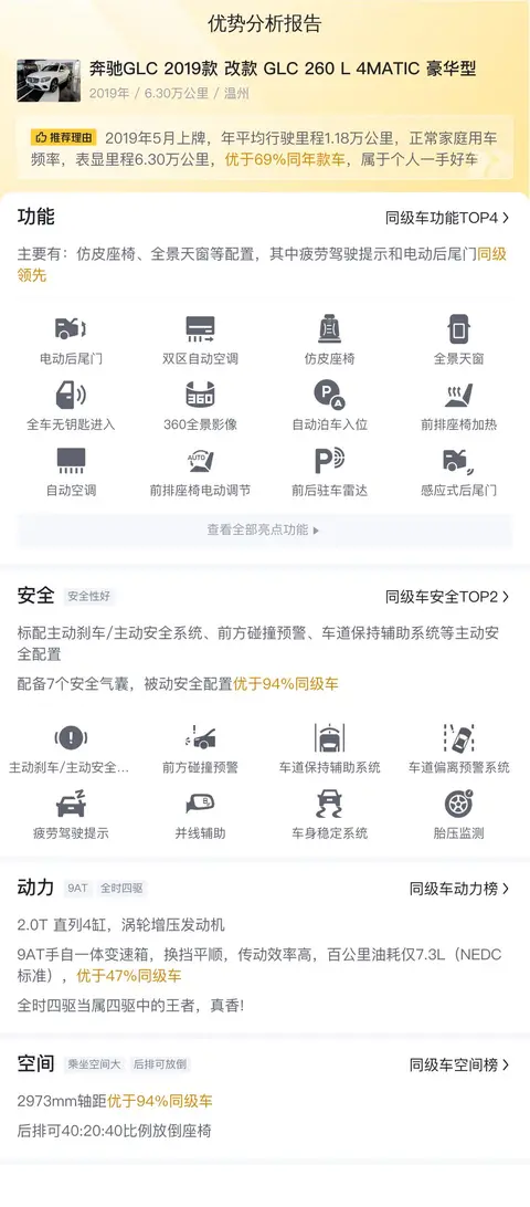 据估算,同级车的最低用车成本是6506元/年,最高是18790元/年,奔驰GLC 2019款 改款 GLC 260 L 4MATIC 豪华型是15182元/年,用车成本适中,不过和同级车比起来,并不占优势。