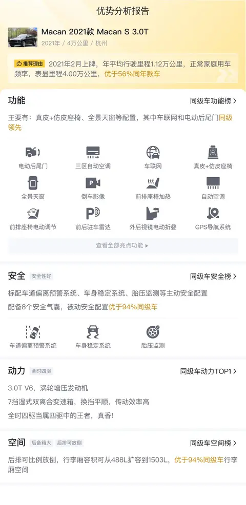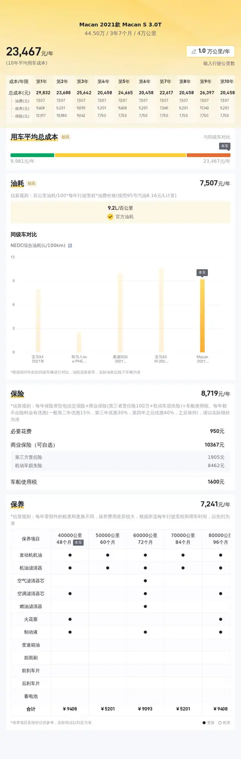 据估算,同级车的最低用车成本是6705元/年,最高是23270元/年,Macan 2021款 Macan S 3.0T是22564元/年,所以用车成本较高。
