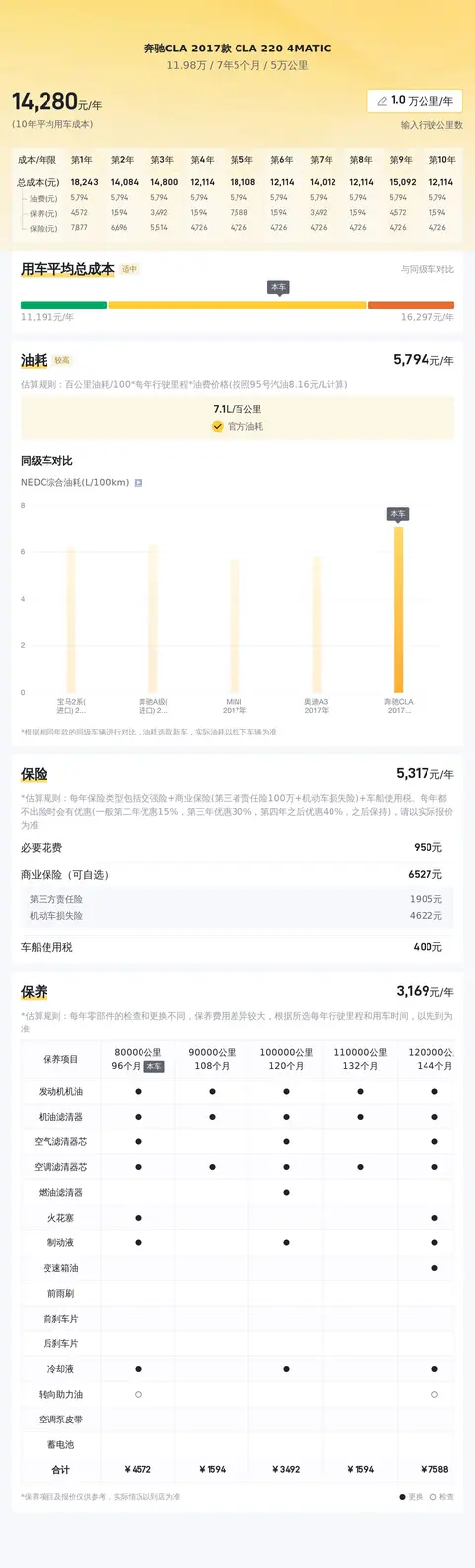在用车成本方面,根据估算,这辆车的年均综合用车成本约为1.4万元左右。需要注意的是,实际费用支出可能会因车主的使用习惯及车辆状况等因素有所变动。