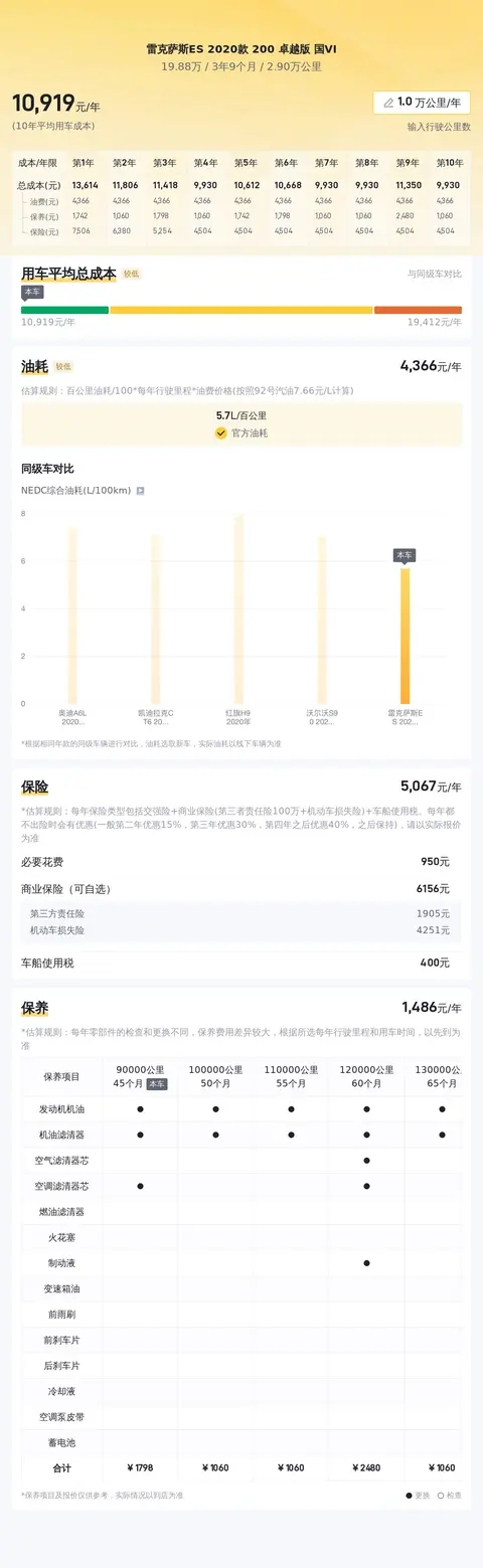 既然是买家庭用车,那肯定得考虑用车成本,咱们买二手车图的就是性价比高,其实雷克萨斯ES的保值率在同级别中表现的就很不错,而这辆ES因为3年多的车龄,所以保养起来更加方便简单,不会像一些冷门车那样存在配件不好买或者保养昂贵的情况。这辆ES的官方百公里油耗是5.7L,不过根据我们在售的二手ES真实油耗统计,这些车的平均油耗是6.8L/百公里,这个油耗成绩放在一众中大型轿车里表现相当不错。