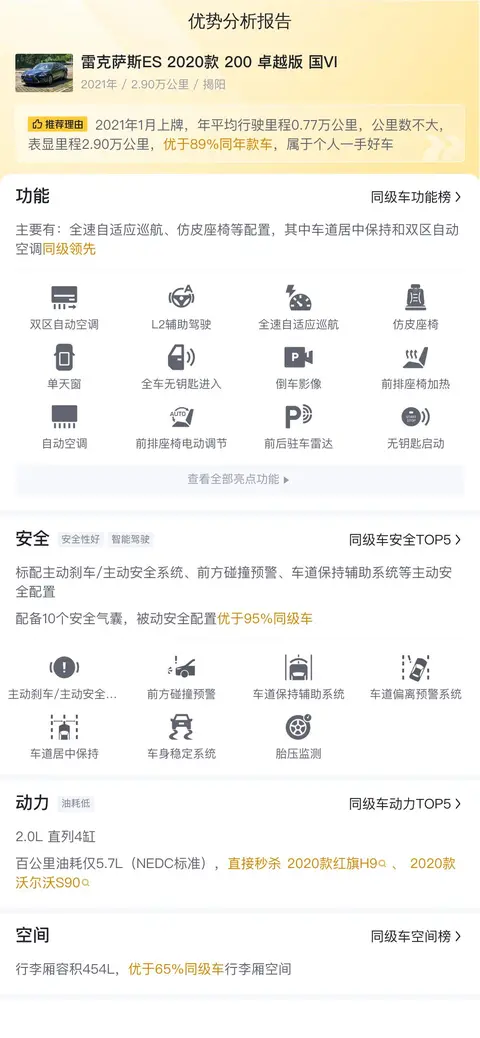 先跟大家聊聊这辆二手雷克萨斯ES 2020款 200 卓越版 国VI的基本情况,它于2021年1月在揭阳上牌,目前行驶了2.9万公里,0过户记录,这个数字里程对于一辆3年多车龄的家用车来说很正常。这辆车的新车指导价是29万,如今二手车报价19.88万。