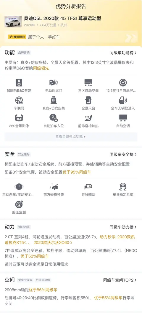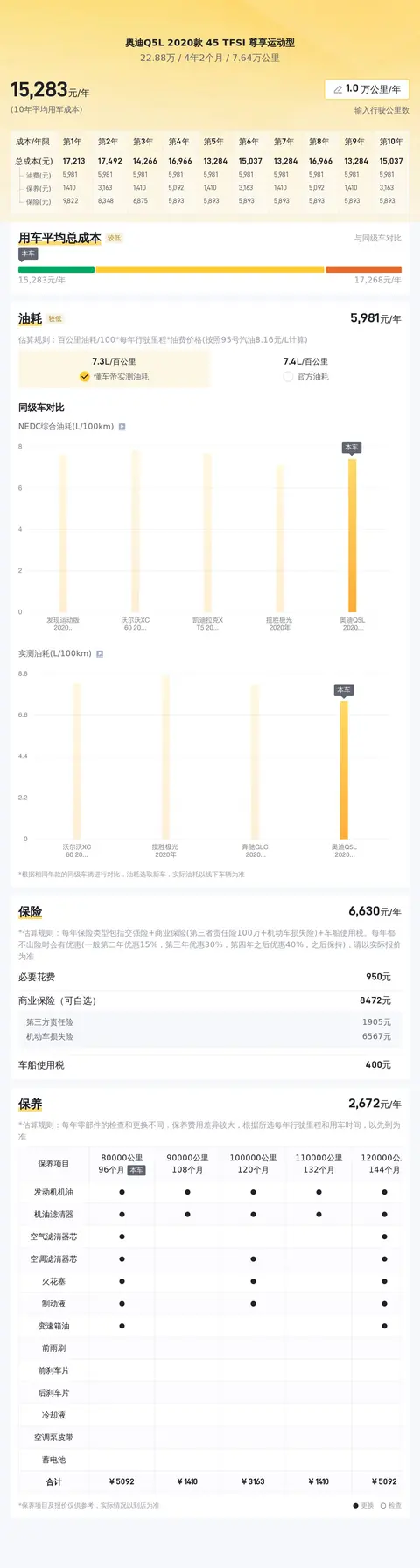 根据懂车帝平台的数据,奥迪Q5L 2020款 45 TFSI 尊享运动型的二手车报价在23.11-28.10万之间,而本次介绍的车辆报价为22.88万,相较于市场价,本车的报价较低,对于想要购买一辆豪华SUV的消费者来说,无疑是一个极具吸引力的价格。从保值率的角度来看,奥迪Q5L 2020款 45 TFSI 尊享运动型也表现不俗。根据懂车帝平台的数据,同级车保值率榜中,奥迪Q5L排名第2位,其3年保值率为57.62%。这意味着即使在未来车主想要出售这辆汽车时,也能获得一个相对较高的售价,进一步降低了车辆的持有成本。奥迪Q5L 2020款 45 TFSI 尊享运动型的10年平均用车成本为15137元/年,这一成本在同级车中处于较高水准。这主要是由于奥迪Q5L是一款豪华SUV,其维护和保养成本相对较高。然而,考虑到其出色的性能和豪华配置,这一成本仍然是合理的。
