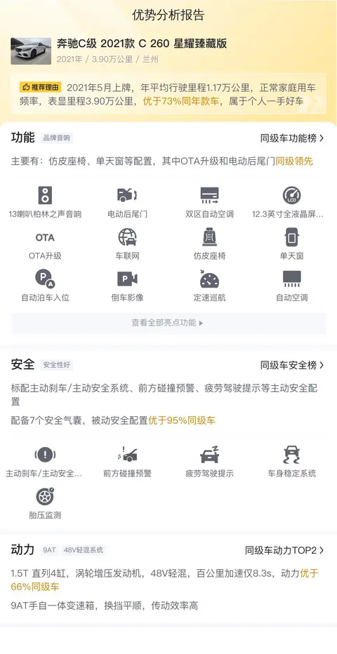 据估算,同级车的最低用车成本是7980元/年,最高是16743元/年,奔驰C级 2021款 C 260 星耀臻藏版是14038元/年,用车成本不算低。