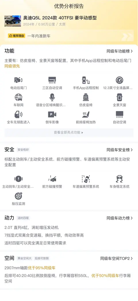 综上所述,奥迪Q5L 2024款 40TFSI 豪华动感型在动力性能、内饰配置、舒适性和安全性等方面表现出色,是一款高品质的中型SUV。这辆车经过懂车帝官方多项检测,获得多项合格证书,消费者可以放心购买。如果您正在寻找一辆豪华中型SUV且预算在30万元左右,那么这辆奥迪Q5L 2024款 40TFSI 豪华动感型将是一个不错的选择。