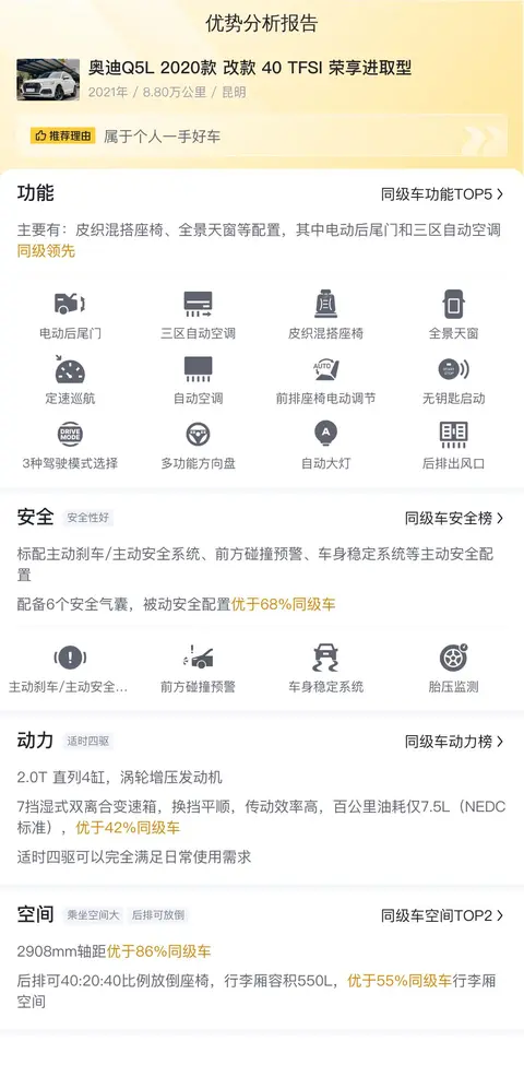 除了车况本身,买家买车还会关注车辆的市场行情、价格、用车成本和保值率等信息。奥迪Q5L 2020款 改款 40 TFSI 荣享进取型的市场行情较好,具有一定的保值率。根据懂车帝的大数据分析,该车型的二手车价格在21.07-25.63万元之间,这辆车的售价为20.30万元,低于市场均价,性价比较高。同时,车辆的用车成本也较为合理,约为1.5万元/年,保养费用约为3300元/年,具体费用因人而异。在保值率方面,该车型的保值率为47.92%,高于同级车平均水平,具有较好的保值性能。
