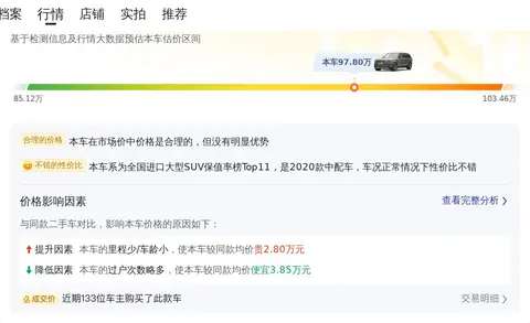 这辆揽胜 2020款 3.0 L6 传世加长版的市场行情价是85.12万-103.46万,它的报价则是97.80万,报价虽然合理,但优势不明显,不过保值率较高,因为它的保值率是56.02%,而同级车的是47.08%。