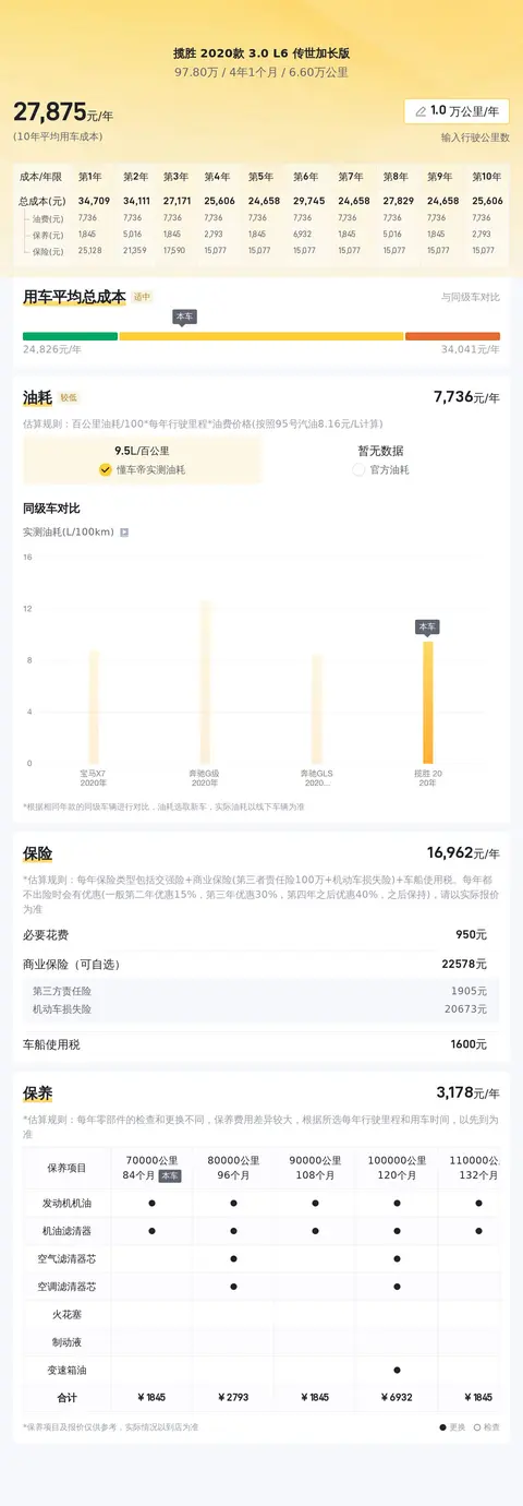揽胜 2020款 3.0 L6 传世加长版的10年平均用车成本是28269元/年,而同级车最低是16944元/年,最高是41304元/年,所以它的用车成本不算低。