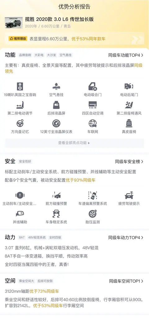 综上所述的新车含税价、用车成本、市场行情、优势分析、同款比价等数据仅供参考。在配置部分,因为二手车非标品,车辆可能会存在配置改装的情况,具体车况信息需要线下结合车辆实际情况进行综合参考。