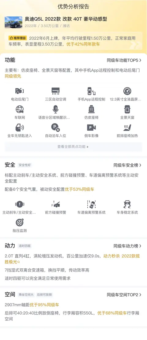 综上所述的新车含税价、用车成本、市场行情、优势分析、同款比价等数据仅供参考。在配置部分,因为二手车非标品,车辆可能会存在配置改装的情况,具体车况信息需要线下结合车辆实际情况进行综合参考。