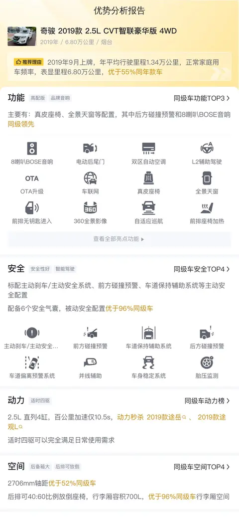 综上所述的新车含税价、用车成本、市场行情、优势分析、同款比价等数据仅供参考。在配置部分,因为二手车非标品,车辆可能会存在配置改装的情况,具体车况信息需要线下结合车辆实际情况进行综合参考。