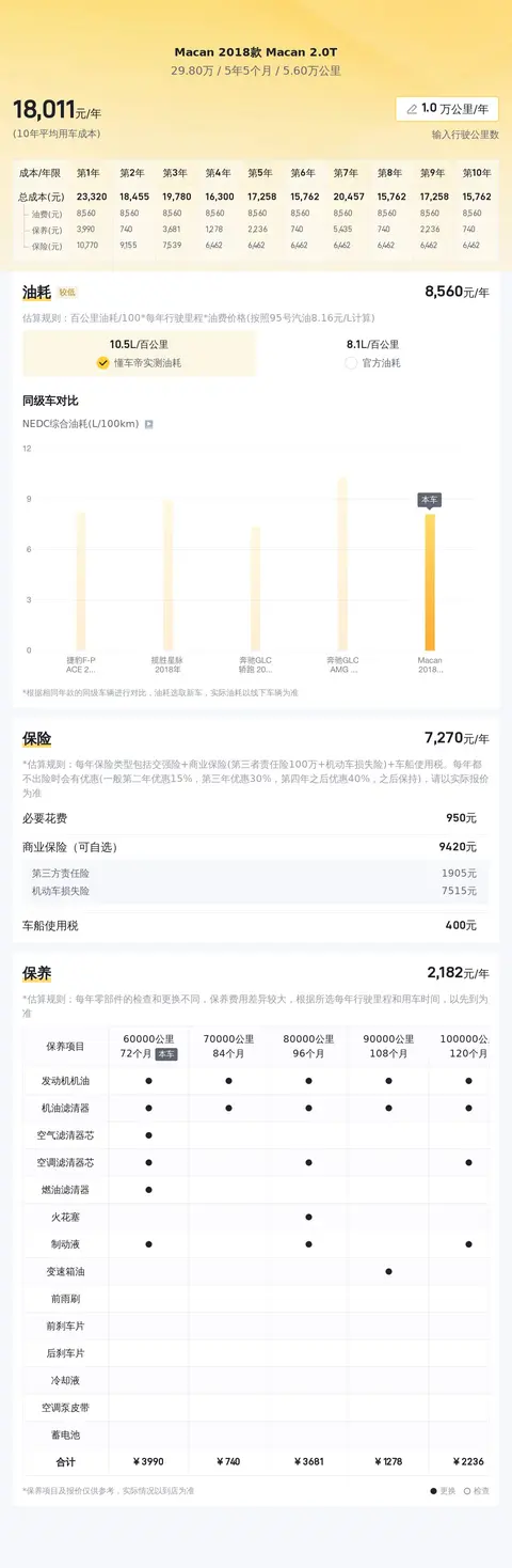 据估算,Macan 2018款 Macan 2.0T的用车成本是18438元/年,不算低,这也与它百公里油耗10.5L有关。