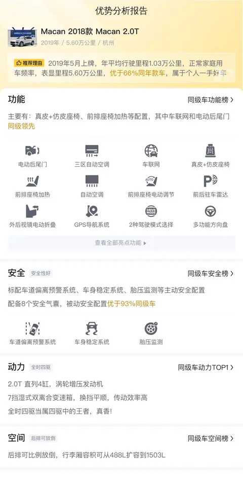 这辆Macan 2018款 Macan 2.0T的行驶里程较短,其实侧面反映出了前任车主对这台车的爱惜。而Macan本身的口碑就比较不错,再加上这台车的售价比较实惠,整体来说还是不错的。只是Macan的后排空间表现一般,如果作为家庭用车使用频率较高的话,可能会需要慎重考虑。不过喜欢驾驶的车友应该对Macan没有抵抗力,毕竞性能和操控,Macan还是拿捏得比较好的。